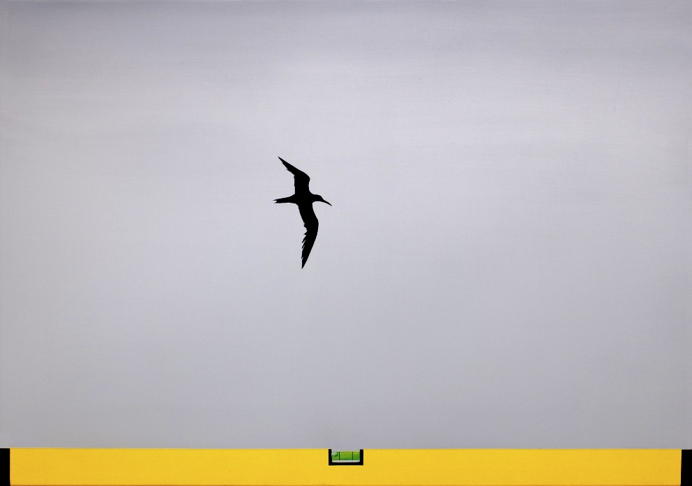 Obrazy Kręcickiego nie obiecują ani społecznej zmiany, ani paruzji Realnego. Będąc malarskim żartem z malarstwa oraz dyskursu prowadzonego o malarstwie, stają się wyzwalającym i parodystycznym metamalarskim dowcipem, który na wystawie w Galerii Szara Kamienica oparty został na grze z definicją obrazu jako reprezentacji i fizycznością – jego oraz tego, co przedstawia. Kręcicki swoje obrazy-obiekty namalował, nawiązując do iluzjonistycznej tradycji trompe-l’œil. Jest tak w przypadku najnowszego płótna artysty, będącego jednocześnie dowcipem o malarstwie i żartem z tradycji pejzażowej z jej postromantyczną i spirytualną zawsze wizją natury, jak również w tytule samej ekspozycji. Na obrazie tym, na tle szarego nieba zastygła czarna sylwetka szybującego na wietrze ptaka z rozpostartymi szeroko skrzydłami, stając się egzystencjalnym znakiem o charakterze metafory. To naturalnie żart, a dowcip polega na tym, że ptak odrysowany został z szablonów, jakie naklejane są na ekrany akustyczne stawiane wzdłuż dróg. Ptak okazuje się wyciętym z plastikowej folii przedmiotem, a szare niebo zaledwie brudem nałożonym na szybę. Pejzaż ten ramowany jest natomiast od dołu przez – namalowaną i usytuowaną w konwencji parapetu na renesansowych obrazach – poziomicę. To właśnie jej angielska nazwa – spirit level – dała tytuł całej wystawie; tylko tyle i aż tyle zostało z duchowych wymiarów malarstwa – Duch w kształcie pęcherza powietrza. (Wojciech Szymański)