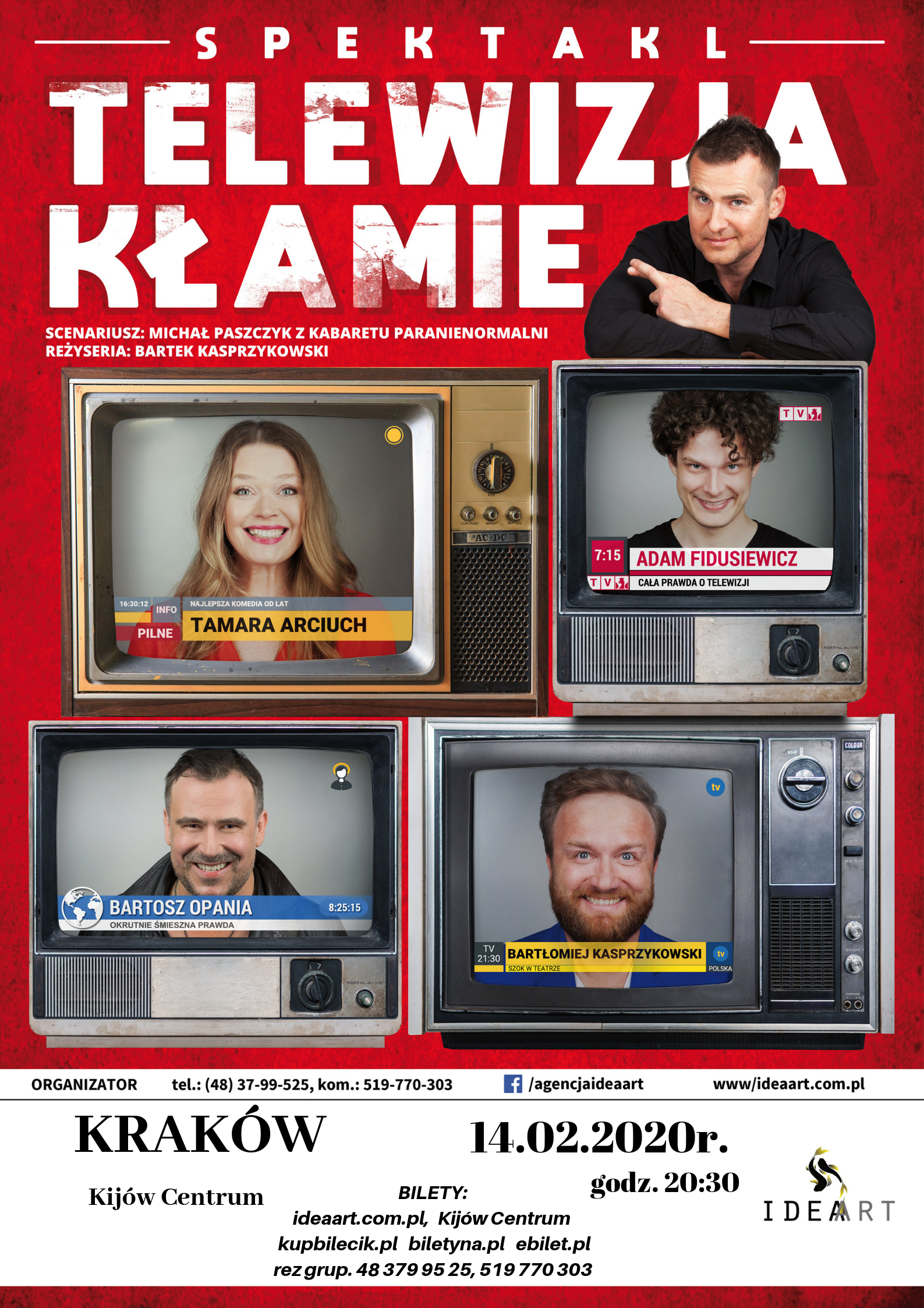 Aktorzy wcielając się w postacie znanych prezenterów telewizyjnych pokazują nie tylko co się dzieje na oczach telewidza, ale i to co się dzieje w telewizyjnym studiu po wyłączeniu kamer i zejściu z wizji. A do wyboru jest TVP, TVN, Polsat i TV Trwam. Widzowie spektaklu wreszcie będą mogą zobaczyć jak zachowują się gwiazdy znane ze szklanego ekranu gdy telewizyjny uśmiech schodzi im z twarzy. Czy zbieżność nazwisk jest przypadkowa? Ocenicie Państwo sami. Autor spektaklu, Michał Paszczyk z kabaretu Paranienormalni, gwarantuje, że popłaczecie się... ze śmiechu!!