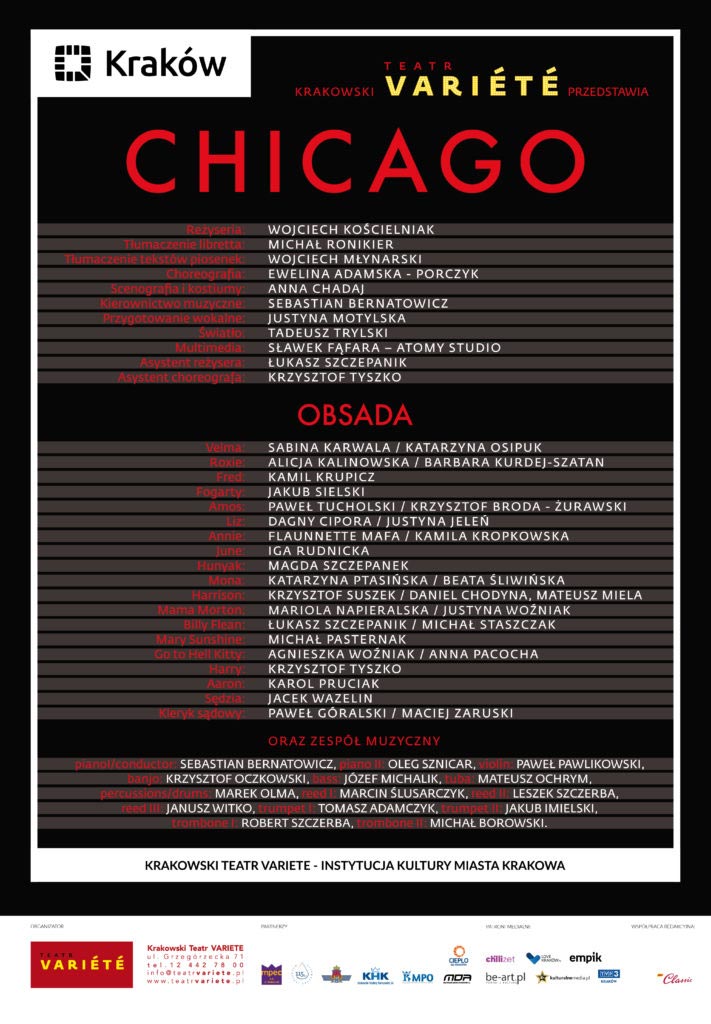 Premiera: 25 listopada 2017Już jesienią pierwszy raz w Krakowie będzie można zobaczyć musical CHICAGO. Spektakl oparty jest na autentycznych wydarzeniach, które miały miejsce w Chicago w latach 20-tych. Reporterka Chicago Tribune opisała historię dwóch kobiet, które trafiają do więzienia i stają przed sądem za morderstwa.