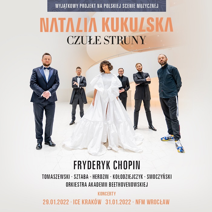 Na płycie „Czułe struny” znalazły się najsłynniejsze utwory Fryderyka Chopina, m.in. Etiuda E-dur, Polonez As-dur, Walce a-moll czy Nokturn Es-dur. Te i pozostałe kompozycje Natalia Kukulska zaśpiewa na dwóch niezwykłych koncertach, które odbędą się w przyszłym roku: 29 stycznia w ICE Kraków Congress Centre oraz 31 stycznia w Narodowym Forum Muzyki we Wrocławiu. Artystce towarzyszyć będzie Orkiestra Akademii Beethovenowskiej, a za pulpitem z partyturą miejsca zajmą: Adam Sztaba, Nikola Kołodziejczyk, Jan Smoczyński i Krzysztof Herdzin.