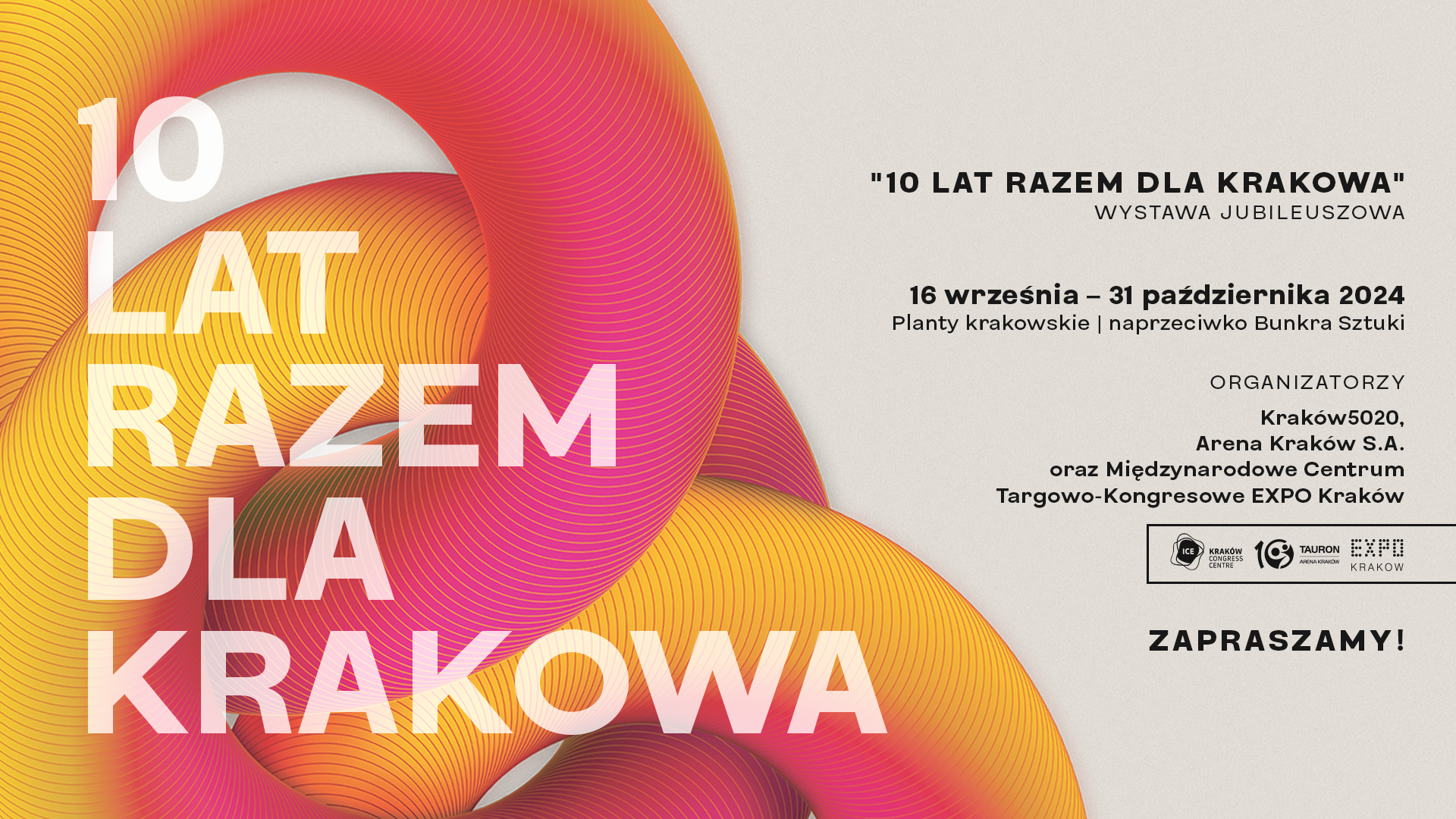 Trzy kluczowe obiekty na mapie Krakowa – Centrum Kongresowe ICE Kraków, TAURON Arena Kraków oraz Międzynarodowe Centrum Targowo-Kongresowe EXPO Kraków – obchodzą w tym roku swoje 10-lecie. Z tej okazji, spółka Kraków 5020, która jest operatorem ICE Kraków, EXPO Kraków i Arena Kraków S.A. zorganizowały wyjątkową ekspozycję „10 LAT RAZEM DLA KRAKOWA”. Wystawa na krakowskich Plantach, naprzeciwko Bunkra Sztuki, potrwa od 16 września do 31 października 2024 roku.