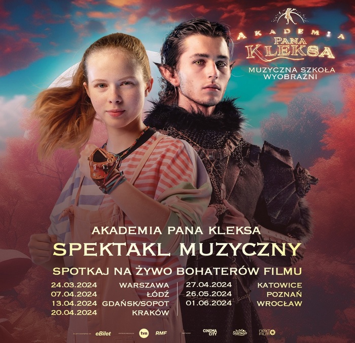 Spektakl muzyczny z udziałem bohaterów najnowszego filmu Akademia Pana Kleksa zaczarował pierwszych widzów na trzech wyprzedanych pokazach w Warszawie. Wszyscy przenieśli się na żywo do wyjątkowej krainy pełnej piosenek, magii i najlepszej zabawy. W Krakowie ten bajkowy spektakl muzyczny odbędzie się 20 kwietnia. Bilety są jeszcze w sprzedaży!