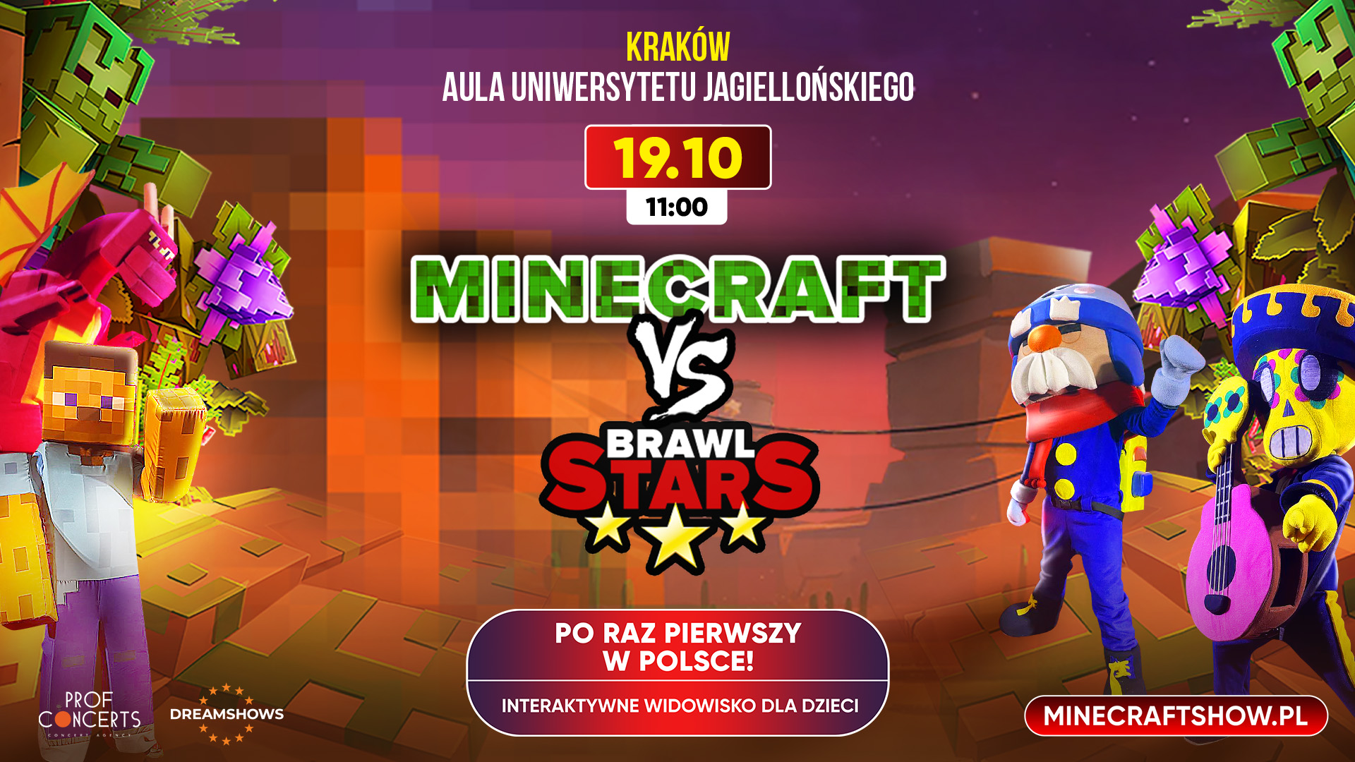 Po raz pierwszy w Polsce spotykają się dwa światy, które podbiły serca milionów dzieci na całym świecie. Ekscytujący, pełen przygód spektakl „Minecraft vs. Brawl Stars” łączy najlepsze elementy kultowych gier wideo z widowiskiem interaktywnym.