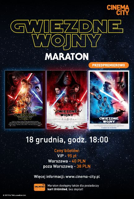 Już 18 grudnia na wszystkich fanów Gwiezdnych Wojen czeka niesamowity gwiezdny maraton! Tego dnia w sieci Cinema City widzowie będą mogli obejrzeć 3 części kultowej sagi: „Gwiezdne wojny: Przebudzenie mocy”, „Gwiezdne wojny: Ostatni Jedi” oraz przedpremierowo, najnowszą część „Gwiezdne wojny: Skywalker. Odrodzenie”, do wyboru w wersji 2D lub w unikalnej, niezwykle komfortowej strefie VIP. Oprócz maratonu Cinema City zaprasza również na pokazy przedpremierowe ostatniej części z trylogii. Bilety można już nabyć w kasach kin oraz na stronie https://www.cinema-city.pl/