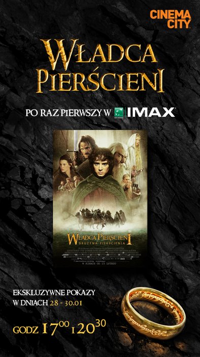 Władca Pierścieni: Drużyna Pierścienia, jedno z największych i najważniejszych filmowych widowisk XXI wieku obchodzi w przyszłym miesiącu 20 rocznicę polskiej premiery. Z tej okazji już w najbliższy weekend, 28 - 30 stycznia sieć Cinema City zaprasza fanów adaptacji prozy Tolkiena na wyjątkowe seanse. Po raz pierwszy w historii na ekranach polskich kin Drużyna Pierścienia zostanie wyświetlona w technologii IMAX.