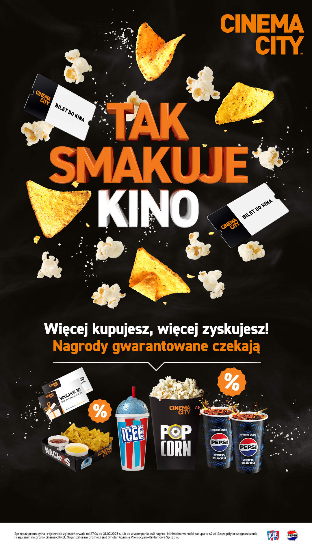 Jak smakuje kino? Żeby się o tym przekonać, wybierz się pomiędzy 27 czerwca a 31 lipca do Cinema City. Ci, którzy w tym okresie kupią bilet na dowolny seans lub skorzystają z oferty kinowego baru, mogą liczyć na atrakcyjne nagrody – darmowe bilety 2D, mega zniżki na przekąski barowe oraz popcorny i napoje gratis. Wszystko w myśl zasady: więcej kupujesz, więcej zyskujesz. A co najważniejsze – nagrody można wybierać samodzielnie. Warunek jest tylko jeden – minimalna wartość zakupu to 49 zł, i co ważne można połączyć dwie transakcje ze sobą. Prosto i smacznie!