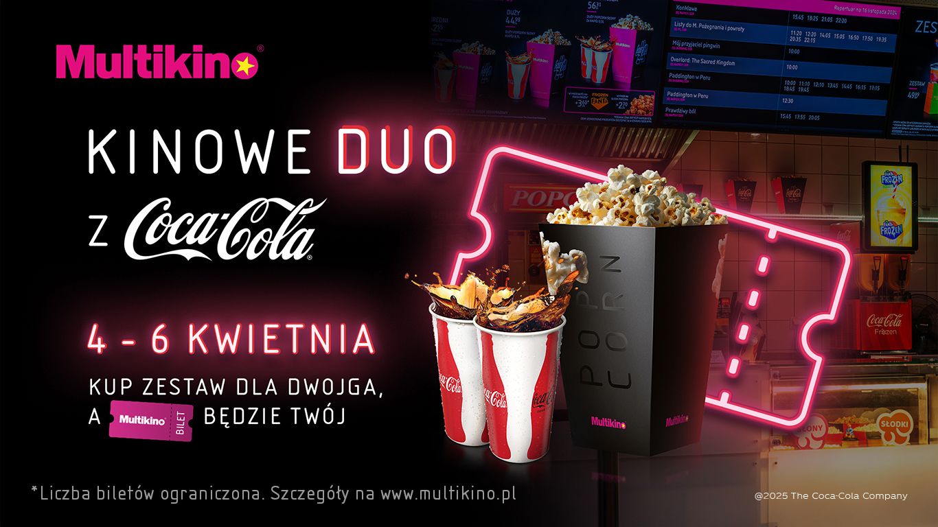 Od 4 do 6 kwietnia w kinach sieci Multikino na widzów czeka kinowe duo z Coca-Colą! Do każdego zakupionego w pierwszy weekend kwietnia zestawu dla dwojga będzie można otrzymać bilet do Multikina na majowe premiery. Pula biletów jest ograniczona. Szczegółowy repertuar znajduje się na stronie www.multikino.pl