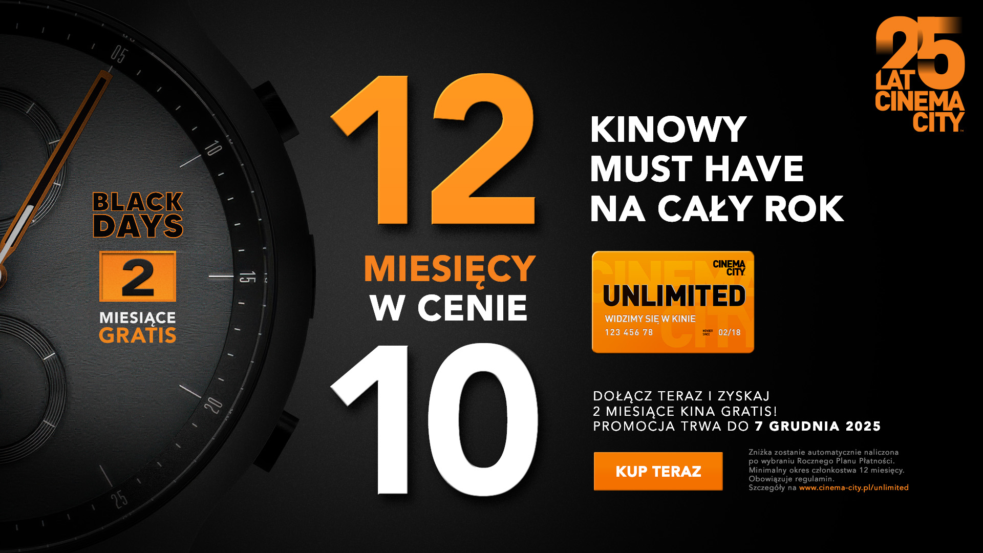 Niewątpliwie na tę gorącą premierę roku czeka wielu zagorzałych kinomanów. W repertuarze Cinema City czas bowiem na Black Days. Ci, którzy pomiędzy 28 listopada a 7 grudnia zakupią roczny abonament kinowy Unlimited, będą mogli zyskać aż dwa miesiące filmowych seansów gratis. A w nadchodzących 12 miesiącach w repertuarze Cinema City będzie z pewnością z czego wybierać wśród hitów kinowych. Już w grudniu na wielkie ekrany wchodzą takie filmy jak: „Pięć koszmarnych nocy 2”, „Brat”, „Wujowy Dwór”, „Zgiń Kochanie” oraz niewątpliwy blockbuster tego roku, czyli „Avatar: Ogień i popiół”. Z kolei w przyszłym roku czekają na nas takie produkcje jak: „Pomoc domowa”, „Wielki Marty”, „Michael”, „Diabeł ubiera się u Prady 2”, „Toy Story 5”, „Vaiana”, „Odyseja”, „Spider-Man. Całkiem nowy dzień”, „Igrzyska śmierci: Wschód słońca w dniu dożynek” czy „Avengers: Doomsday”. Z kartą Unlimited można będzie obejrzeć wszystkie te filmy w Cinema City w abonamencie kinowym, który z uwagi na promocję Black Days, teraz jeszcze bardziej się opłaca.