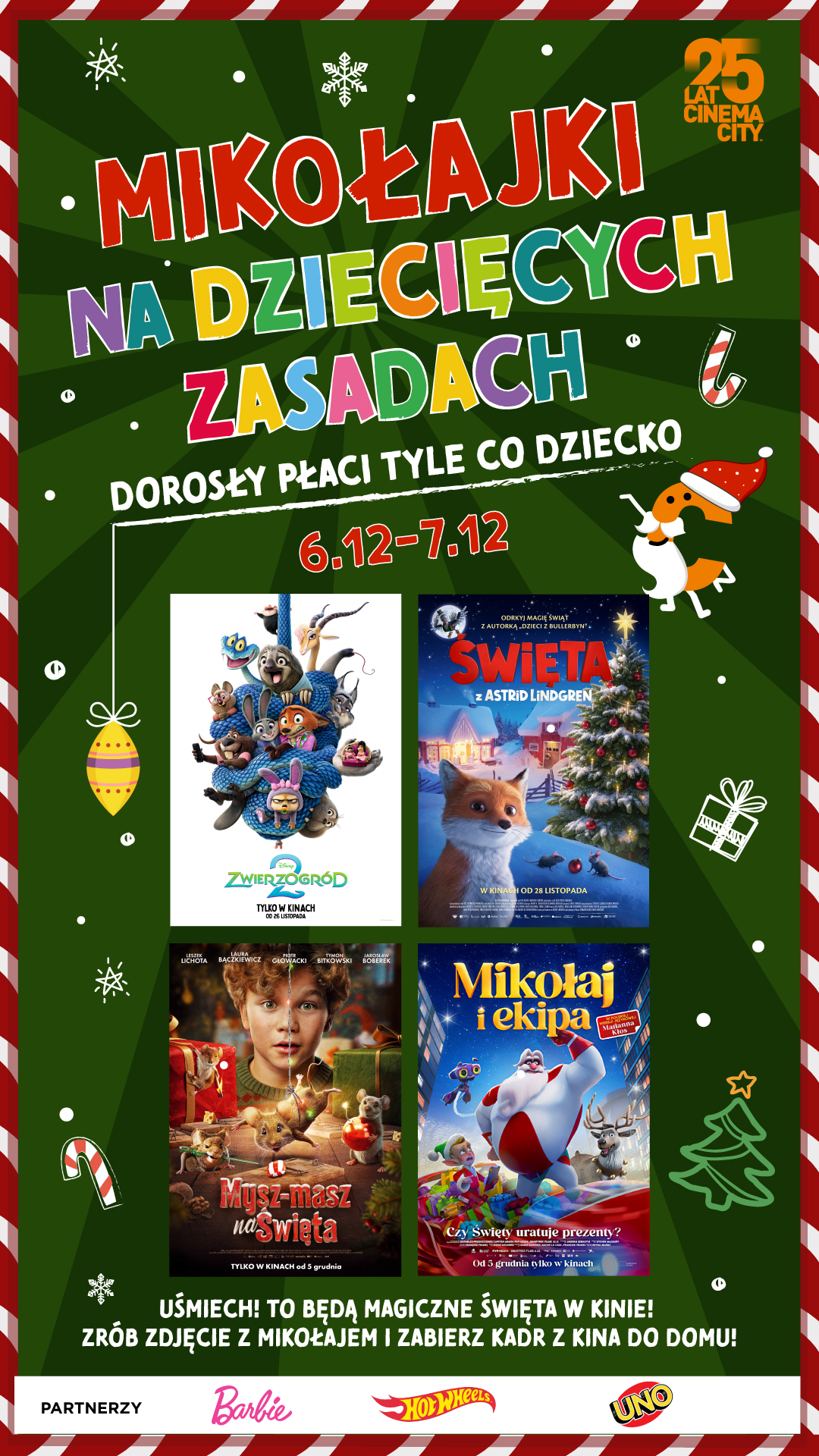 Mikołajki tuż-tuż! Cinema City, jak co roku, przygotowuje z tej okazji mnóstwo niespodzianek dla najmłodszych widzów. W mikołajkowy weekend na wielkim ekranie będą wyświetlane takie filmowe hity, jak „Wicked: Na dobre”, „Zwierzogród 2”, „Bing: święta i inne opowieści”, „Mikołaj i ekipa”, „Święta z Astrid Lindgren” czy „Mysz-masz na Święta”, a także – świąteczne komedie dla całej rodziny: „Uwierz w Mikołaja 2” oraz „Piernikowe serce”. W wybranych kinach dzieci będą mogły zrobić sobie zdjęcie z Mikołajem i Elfinką. Mało tego, w Mikołajki Cinema City rusza z konkursem „Święta na dziecięcych zasadach”, w którym wygrać będzie można bilety do kina i zabawki.