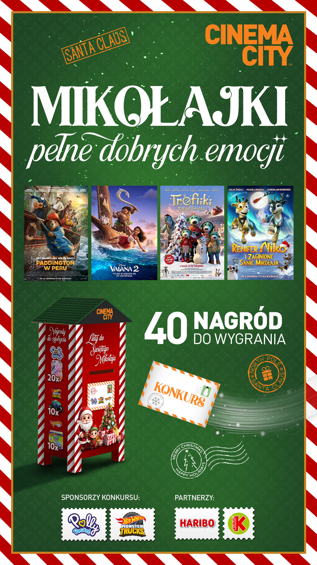 Wielkimi krokami zbliżają się Mikołajki. To idealna okazja do tego, żeby wybrać się do kina z najmłodszymi i wyruszyć z nimi w pełną wrażeń i emocji filmową przygodę. A będzie w czym wybierać! W Cinema City obejrzeć będzie można w tym czasie takie hity, jak m.in. „Renifer Niko i zaginione sanie Mikołaja”, „Vaiana 2”, „Paddington w Peru”, „Wicked”, „Trefiliki ratują Święta”, czy „Kina i Yuk”. W mikołajkowy weekend (6-8 grudnia) dzieciom przed seansami rozdawane będą słodkie niespodzianki – m.in. soczki Kubuś i żelki Haribo. Dodatkowo Cinema City przygotowało dla dzieci i ich rodziców świąteczny konkurs!