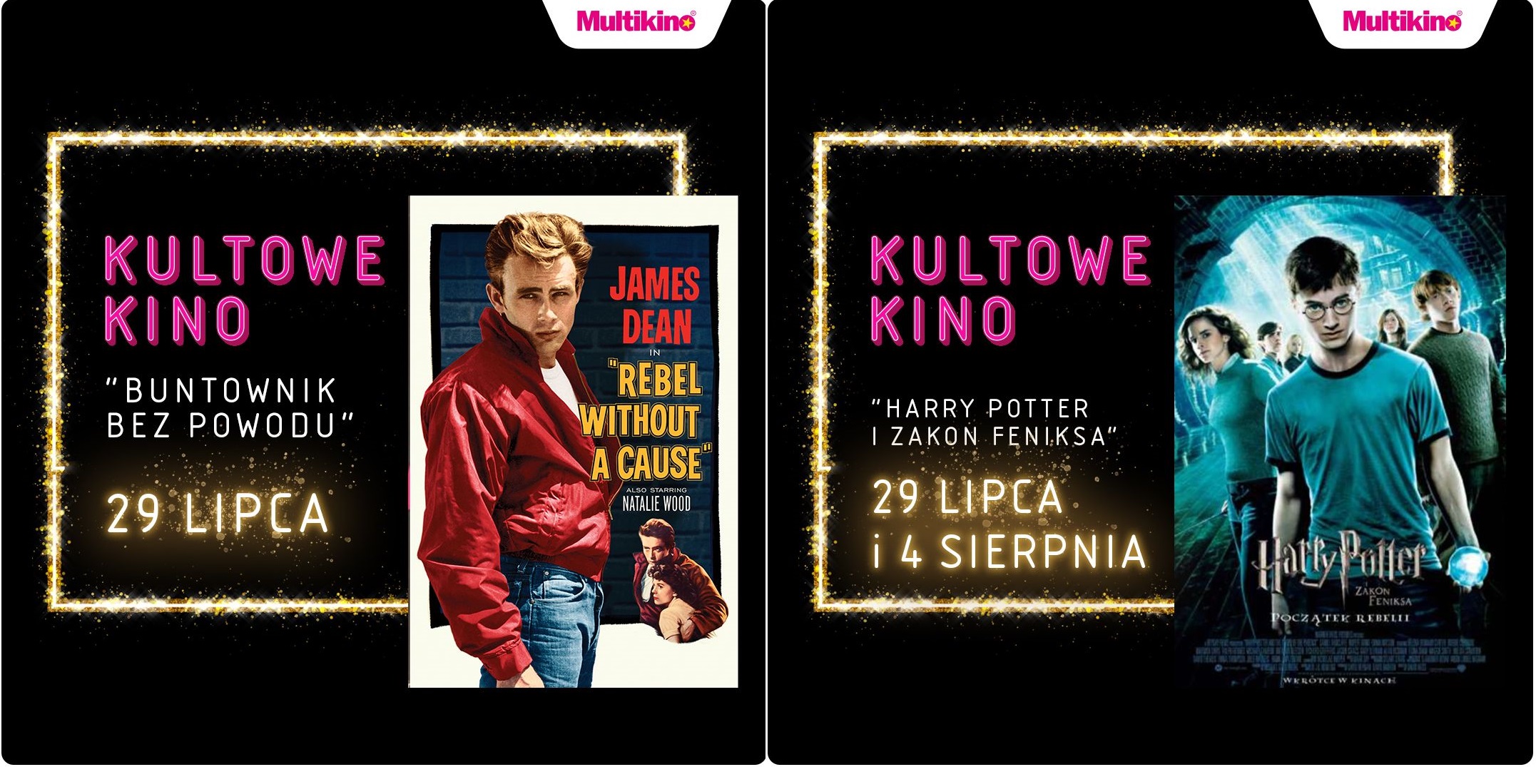 29 lipca w kinach sieci Multikino w ramach cyklu „Kultowe Kino” widzowie będą mogli zobaczyć o 17.30 film „Harry Potter i Zakon Feniksa” (powtórka w niedzielę 4 sierpnia), a o 20.00 „Buntownik bez powodu”. Bilety można już nabyć w kasach kin, na stronie internetowej www.multikino.pl oraz przez aplikację mobilną.