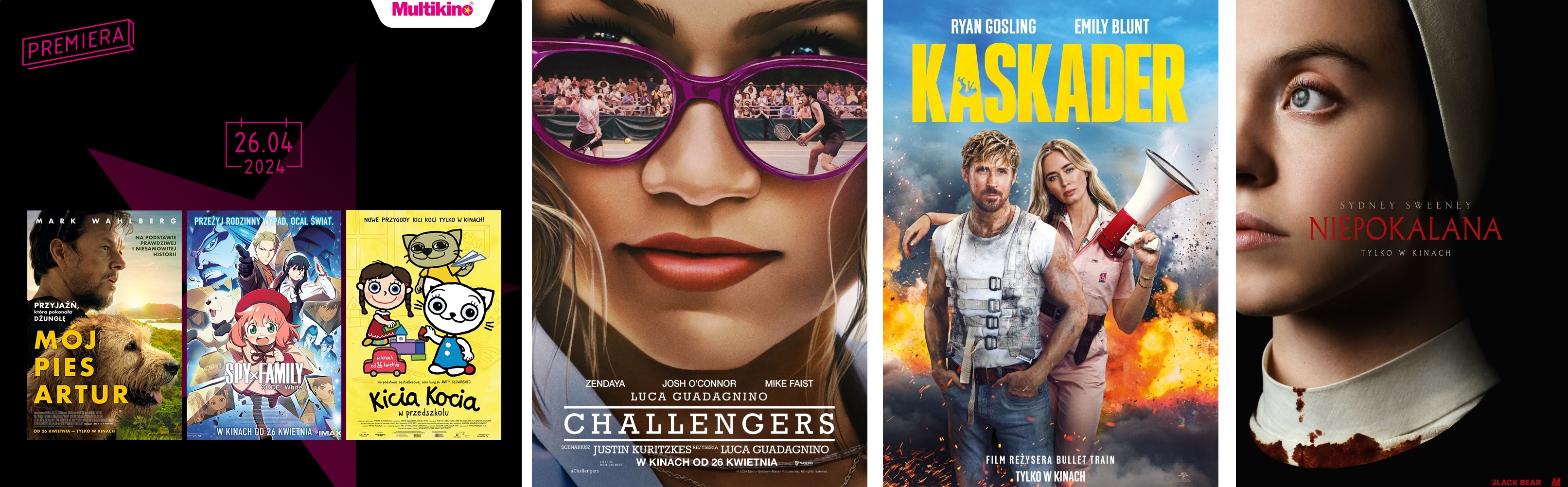 Od 26 kwietnia we wszystkich kinach sieci Multikino można oglądać premierowo aż pięć produkcji: „Challengers” z Zendayą w roli głównej, horror „Niepokalana” z Sydney Sweeney, film przygodowy „Mój pies Artur” z Markiem Wahlbergiem, anime „Spy X Family Code: White” oraz dla najmłodszych „Kicia Kocia w przedszkolu”. Ponadto 26, 27 i 28 kwietnia oraz 1 i 2 maja przedpremierowo będzie można zobaczyć film „Kaskader”. Szczegółowy repertuar jest dostępny na stronie www.multikino.pl.