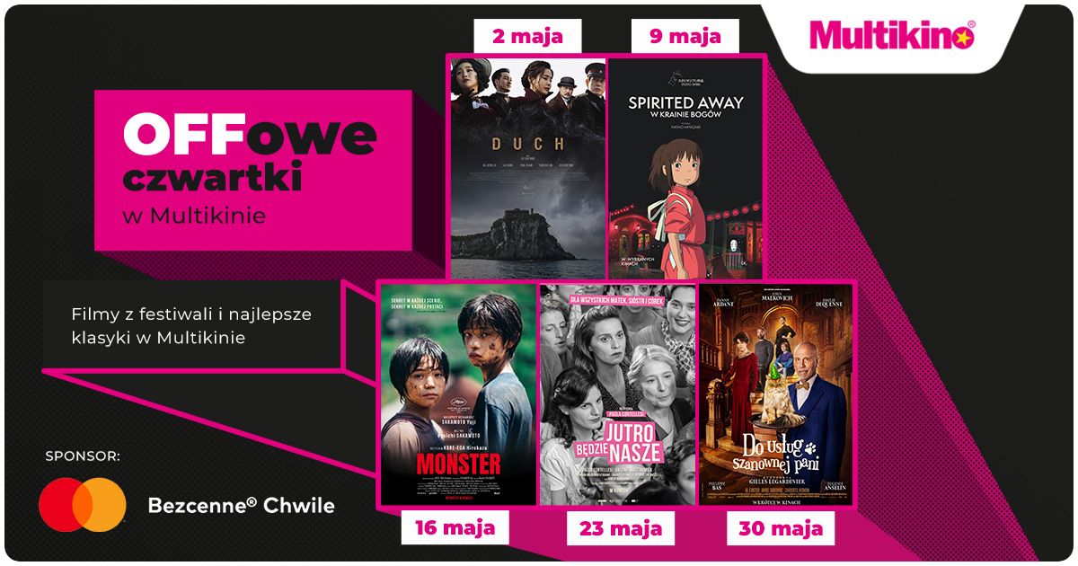 W majowym repertuarze „OFFowych czwartków” w Multikinie widzowie znajdą: „Ducha”, „Spirited Away: W krainie bogów”, „Monster”, „Jutro będzie nasze” oraz „Do usług szanownej Pani ". Szczegółowy repertuar jest dostępny na stronie www.multikino.pl.