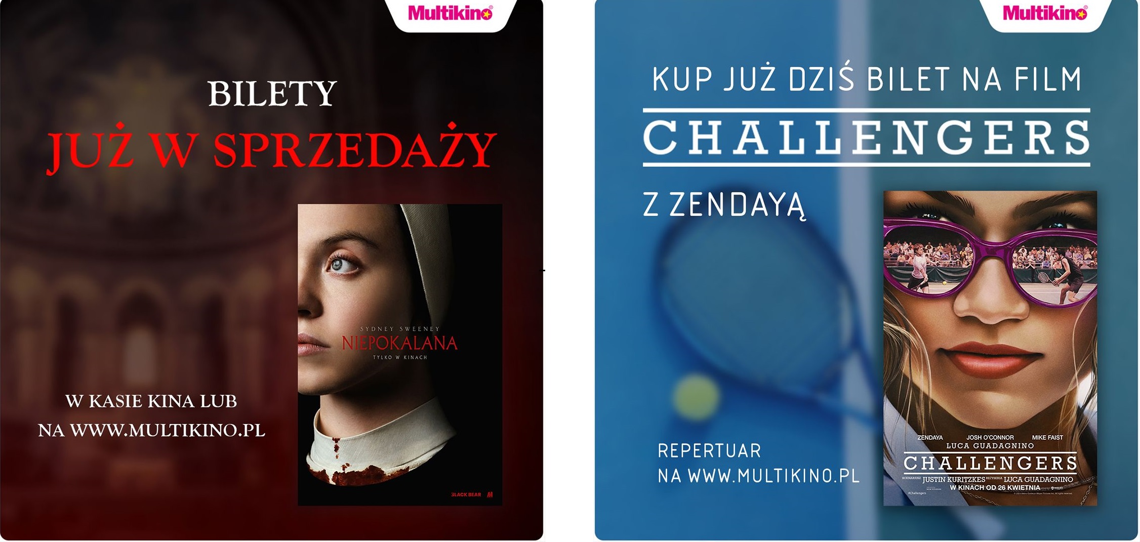 Multikino rozpoczęło przedsprzedaż biletów na dwie kwietniowe premiery: dramat sportowy „Challengers” oraz horror „Niepokalana”. Obie produkcje będzie można zobaczyć w kinach sieci Multikino już 26 kwietnia. Bilety są dostępne w kasach kin sieci Multikino, na www.multikino.pl oraz w aplikacji mobilnej.
