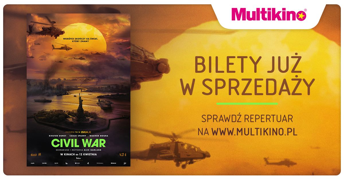 Multikino rozpoczęło przedsprzedaż biletów na film akcji „Civil War” w reżyserii Alex Garland. Produkcję będzie można zobaczyć we wszystkich kinach sieci Multikino wieczorem od 11 kwietnia i wejdzie na wielkie ekrany 12 kwietnia. Bilety są dostępne w kasach kin sieci Multikino, na www.multikino.pl oraz w aplikacji mobilnej.