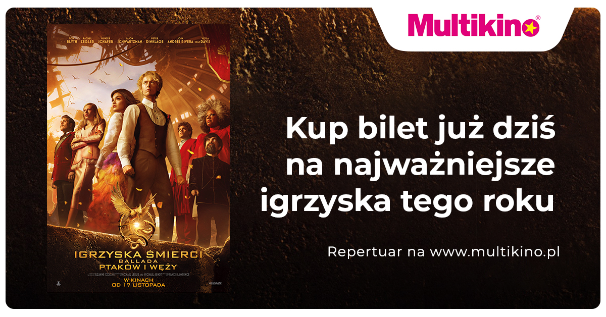 Już dziś kupisz bilety do Multikina na film „Igrzyska śmierci: Ballada ptaków i węży”! Produkcja wchodzi do kin 17 listopada, a pierwsze pokazy odbędą się już 16 listopada wieczorem. Bilety już są dostępne w kasach kin sieci Multikino, na www.multikino.pl oraz w aplikacji mobilnej.