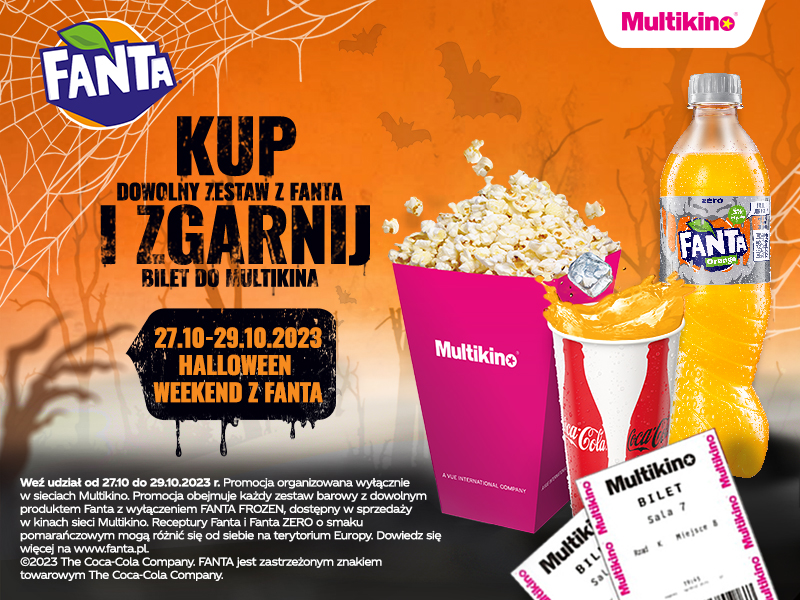 Od 27 do 29 października na widzów w Multikinie czekają nie tylko najlepsze filmowe premiery, ale również weekend z Fantą! Klienci kupując zestaw z Fantą odbiorą bilet na dowolny film z listopadowego repertuaru! Ponadto w wybranych kinach można zrobić sobie zdjęcia w fotobudkach Fanty przygotowanych specjalnie na Halloween.