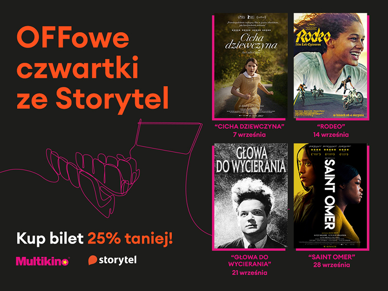 We wrześniu w repertuarze „OFFowych czwartków ze Storytel” w Multikinie uczestnicy zobaczą: „Cichą dziewczynę", „Rodeo", „Głowa do wycierania" oraz „Saint Omer”. Szczegółowy repertuar jest dostępny na stronie www.multikino.pl.