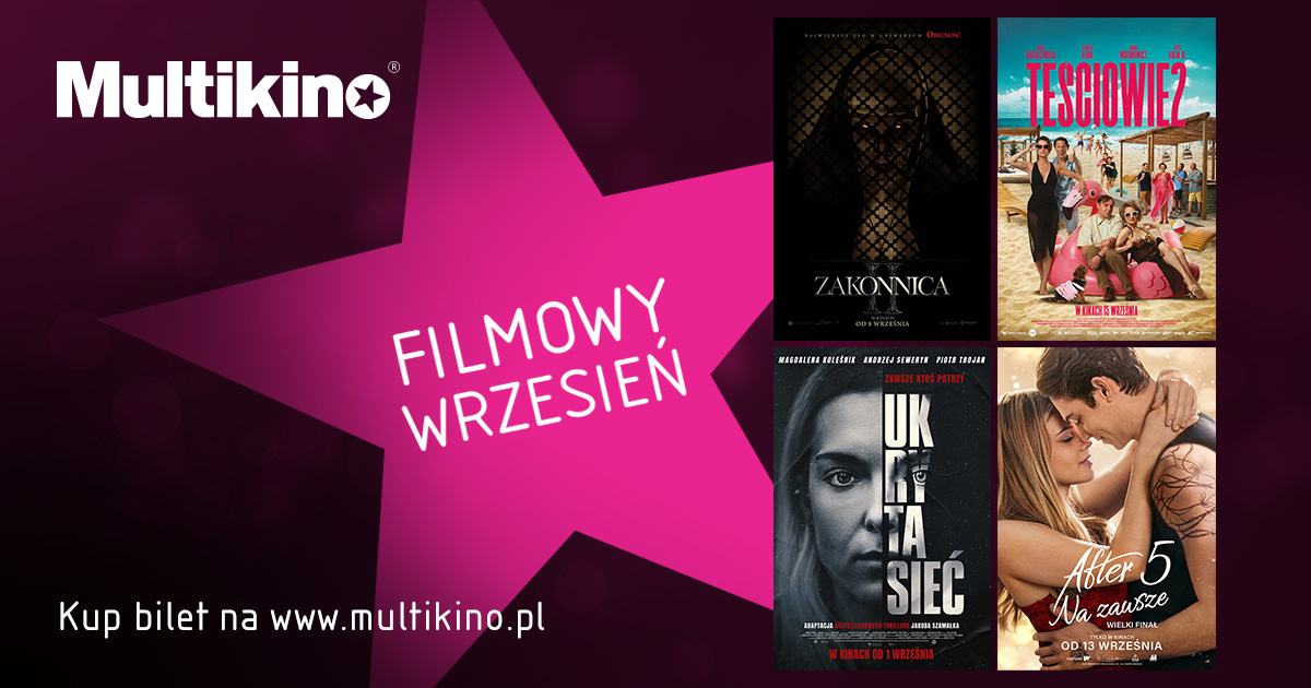 Wrzesień, to doskonały moment, żeby nadrobić kinowe hity tegorocznych wakacji – „Barbie” i „Oppenheimera” oraz zobaczyć nowe premiery, między innymi: „Zakonnicę II”, komedię „Teściowie 2”, thriller „Ukryta sieć” czy „After 5. Na zawsze”. Szczegółowy repertuar jest dostępny na stronie www.multikino.pl.
