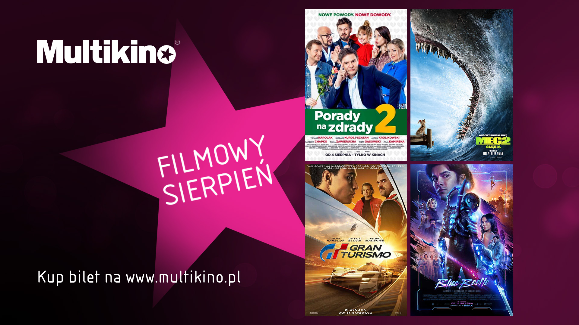 Wakacyjne premiery podgrzewają kinowe ekrany do czerwoności! Wiele emocji i niezapomnianych wrażeń czeka również na widzów Multikina w sierpniu. W repertuarze znajdą między innymi: „Meg 2: Głębia”, „Porady na zdrady 2” , „Gran Turismo” oraz „Blue Beetle”. Szczegółowy repertuar jest dostępny na stronie www.multikino.pl.