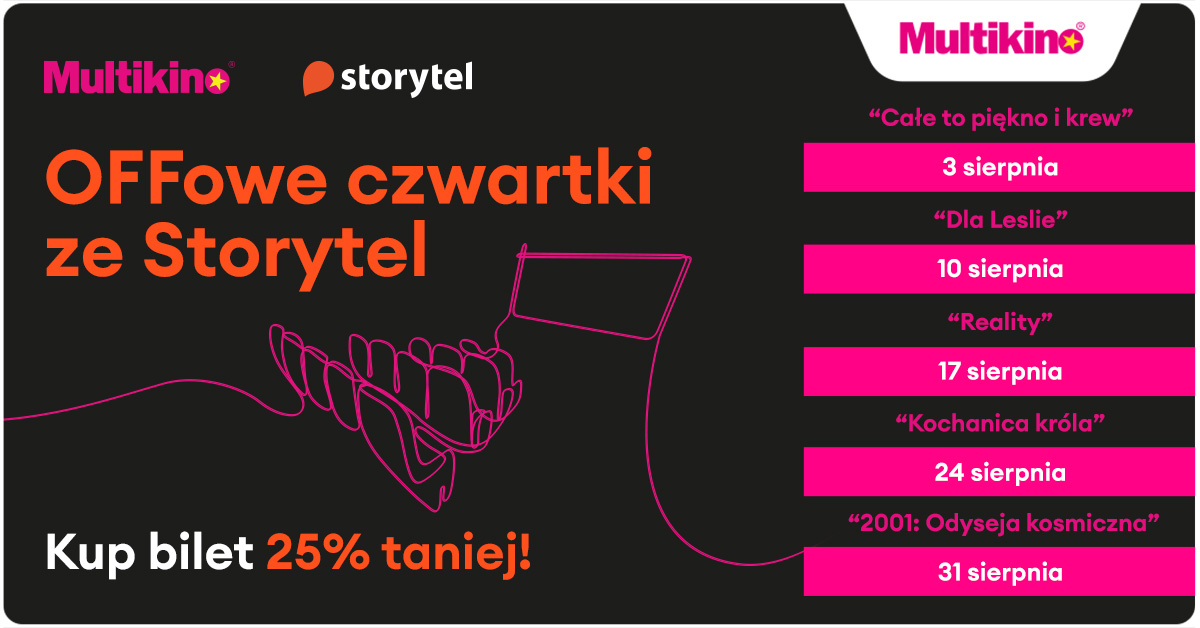 Podczas cyklu „OFFowe czwartki ze Storytel” w sierpniu uczestnicy pokazów filmowych zobaczą: „Całe to piękno i krew", „Dla Leslie", „Reality", „Kochanicę króla Jeanne du Barry” i „2001: Odyseja kosmiczna" - kultowy film Stanleya Kubricka. Szczegółowy repertuar jest dostępny na stronie www.multikino.pl.