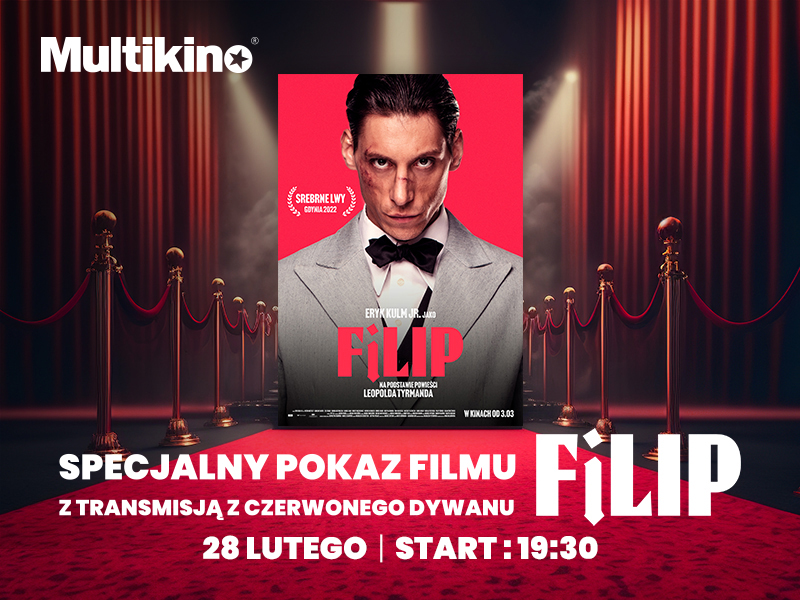 28 lutego br. w kinach sieci Multikino odbędzie się przedpremierowy pokaz filmu „Filip” nagrodzonego Srebrnymi Lwami na 47. FPFF w Gdyni. Uczestnicy tego wydarzenia przed rozpoczęciem seansu zobaczą na wielkim ekranie transmisję na żywo z uroczystej premiery filmu w warszawskim Multikinie Złote Tarasy. Bilety na przedpremierowy pokaz z relacją z czerwonego dywanu są dostępne w kasach kin sieci Multikino, na www.multikino.pl oraz w aplikacji mobilnej.