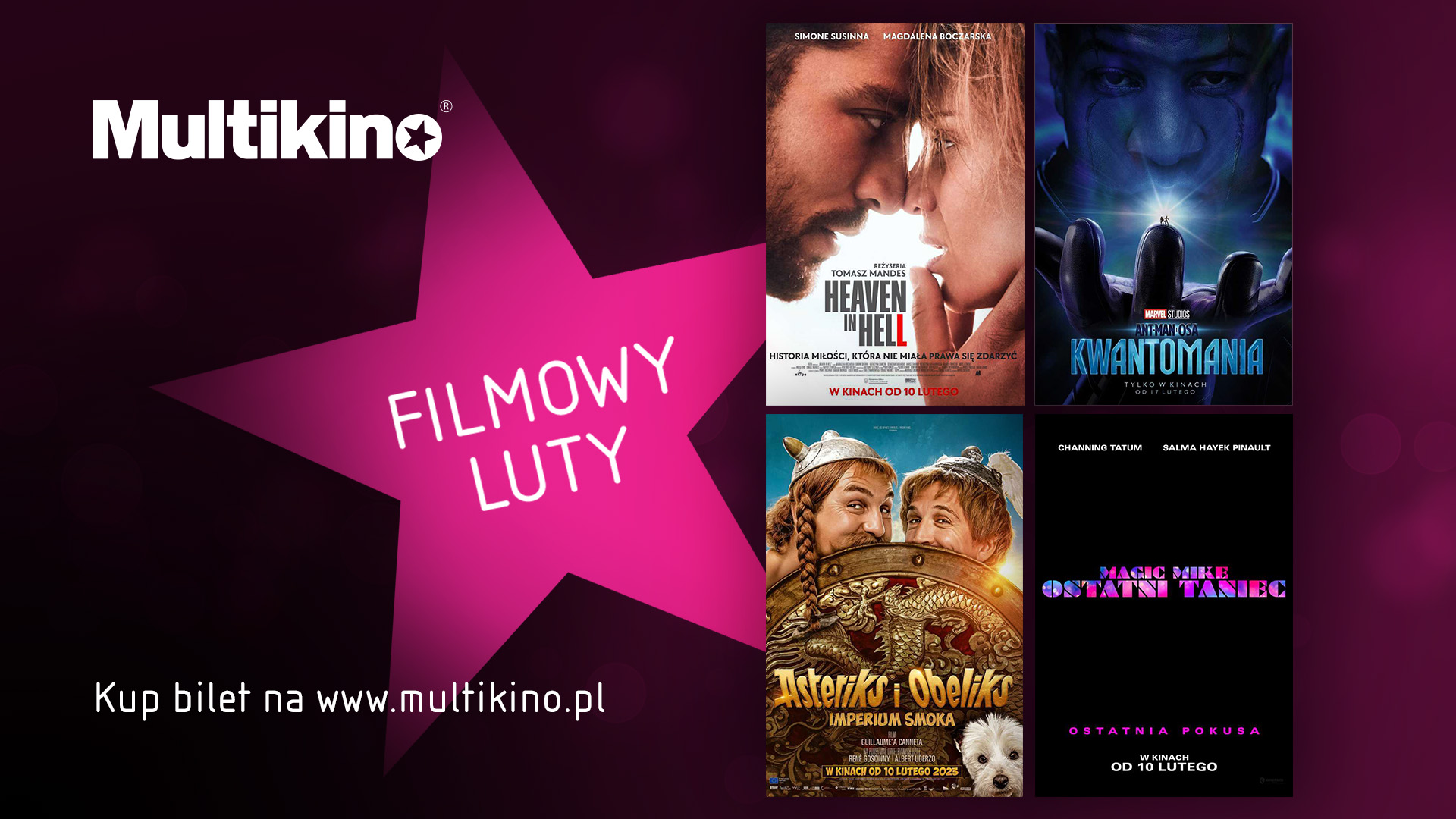 Luty 2023 roku to wiele okazji, żeby odwiedzić Multikino! Zaczynając od walentynek, przez premiery horrorów oraz pierwszej produkcji Marvela, a kończąc na trwających feriach zimowych! Na widzów będą czekały między innymi: „Heaven in Hell” z Magdaleną Boczarską, „Magic Mike's Last Dance”, komedia „Masz Ci los!”, „Ant-Man i Osa: kwantomania” oraz „Biuro detektywistyczne Lassego i Mai. Tajemnica skorpiona”, „Asteriks i Obeliks: Imperium Smoka”.