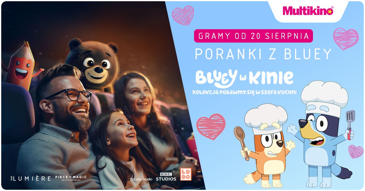 Już od 20 sierpnia całą rodziną można wyruszyć na kulinarną przygodę z Bluey – pełną śmiechu, pysznych pomysłów i zabawy bez końca! Multikino zaprasza na wyjątkowy seans „Bluey w kinie: Kolekcja Pobawmy się w szefa kuchni” – to aż godzina radości z ulubionymi bohaterami serialu, który pokochały dzieci (i rodzice!) na całym świecie.