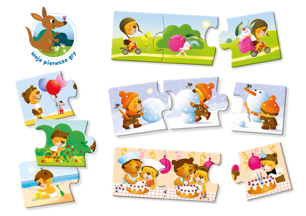 Połóżcie wszystkie puzzle obrazkami do góry. Dopasujcie obrazki w taki sposób, aby opowiedzieć, co robi miś.