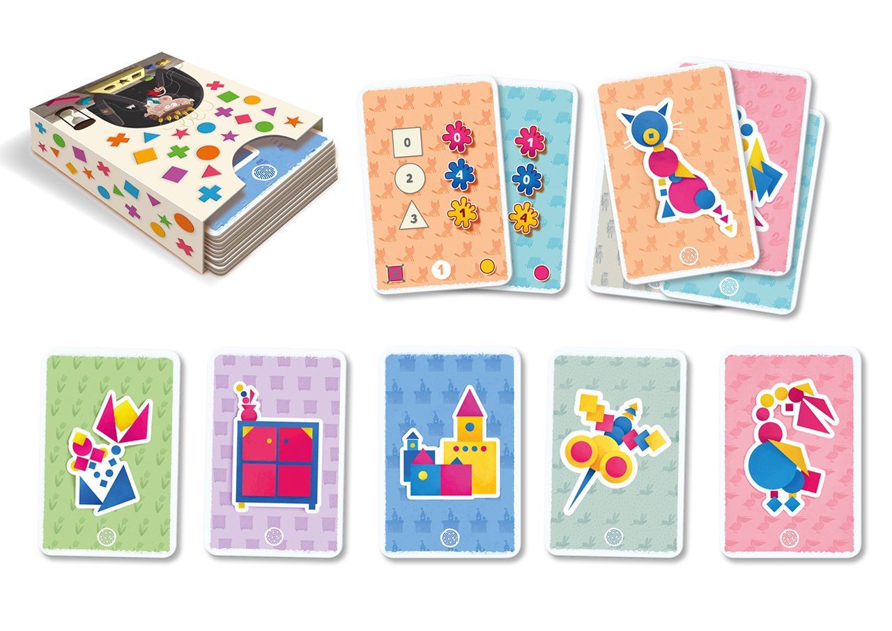 1. Jeden z graczy dobiera kartę, wyciągając ją ze specjalnego pudełka i kładąc odkrytą na stole. Karta przedstawia obrazek złożony z figur, które mają różne wielkości i kolory.