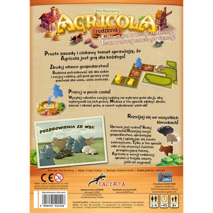 Zbuduj własne gospodarstwo: będziesz potrzebować izb dla siebie i swojej rodziny, pól pod uprawy oraz pastwisk dla wielu, wielu zwierząt. Pracuj w pocie czoła: wysyłaj członków swojej rodziny na wybrane pola akcji, aby wykonywali na nich pracę. Możesz w ten sposób zdobyć zboże, zaorać i obsiać pola, a nawet wybudować wiatrak. Rozwijaj się we wszystkich kierunkach: uprawa jest nudna? Hoduj zwierzęta! Rozwijaj swoje gospodarstwo uprawiając rolę i opiekując się swoim zwierzyńcem. Tylko w ten sposób uda ci się stworzyć świetnie prosperujące gospodarstwo. Agricola w wersji rodzinnej to frajda niezależnie od tego, czy wygrasz!