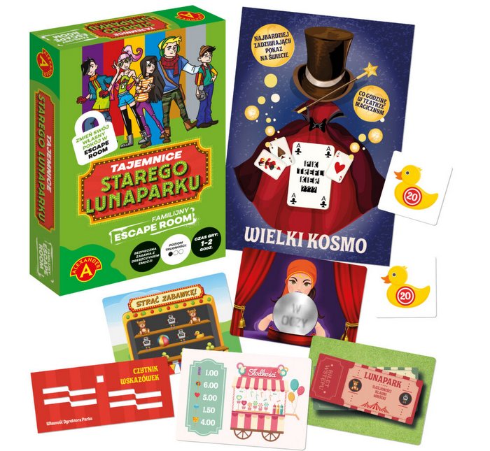 Kupując ten zestaw trafiacie do starego lunaparku, gdzie czeka na Was nie lada gratka! Festyn i gra terenowa ogłoszona przez Dyrektora Parku. Nagrodą jest wstęp na okolicznościowy bankiet pełen arcymistrzów iluzji, tajemniczych wróżek i wspaniałych akrobatów. Tylko że ten lunapark skrywa niejedną tajemnicę, którą będziecie musieli rozgryźć…