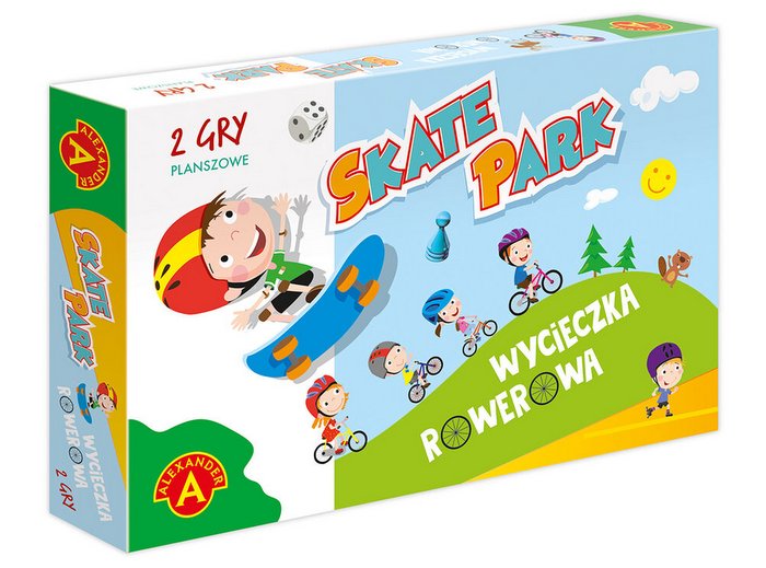 SKATE PARK to miejsce gdzie możesz się wyszaleć sprawdzając swoją sprawność i możliwości w akrobacjach na torze. Macie do wyboru jazdę na rowerze, rolkach, hulajno-dze lub deskorolce. Umiejętność wykonywania ewolucji jest zastąpiona w grze umiejętno-ścią, układania stosu z plastikowych żetonów. Ten, kto w zawodach wykaże się większą zręcznością, opanowaniem i cierpliwością zdobywając określoną liczbę żetonów zostanie zwycięzcą – jeśli przy odrobinie szczęścia ukończy jazdę bez straty wymaganych punktów. By tak się nie stało musisz uważać, by się nie przewrócić lub nie przemęczyć, bo konkurenci tylko czekają na Twój błąd.