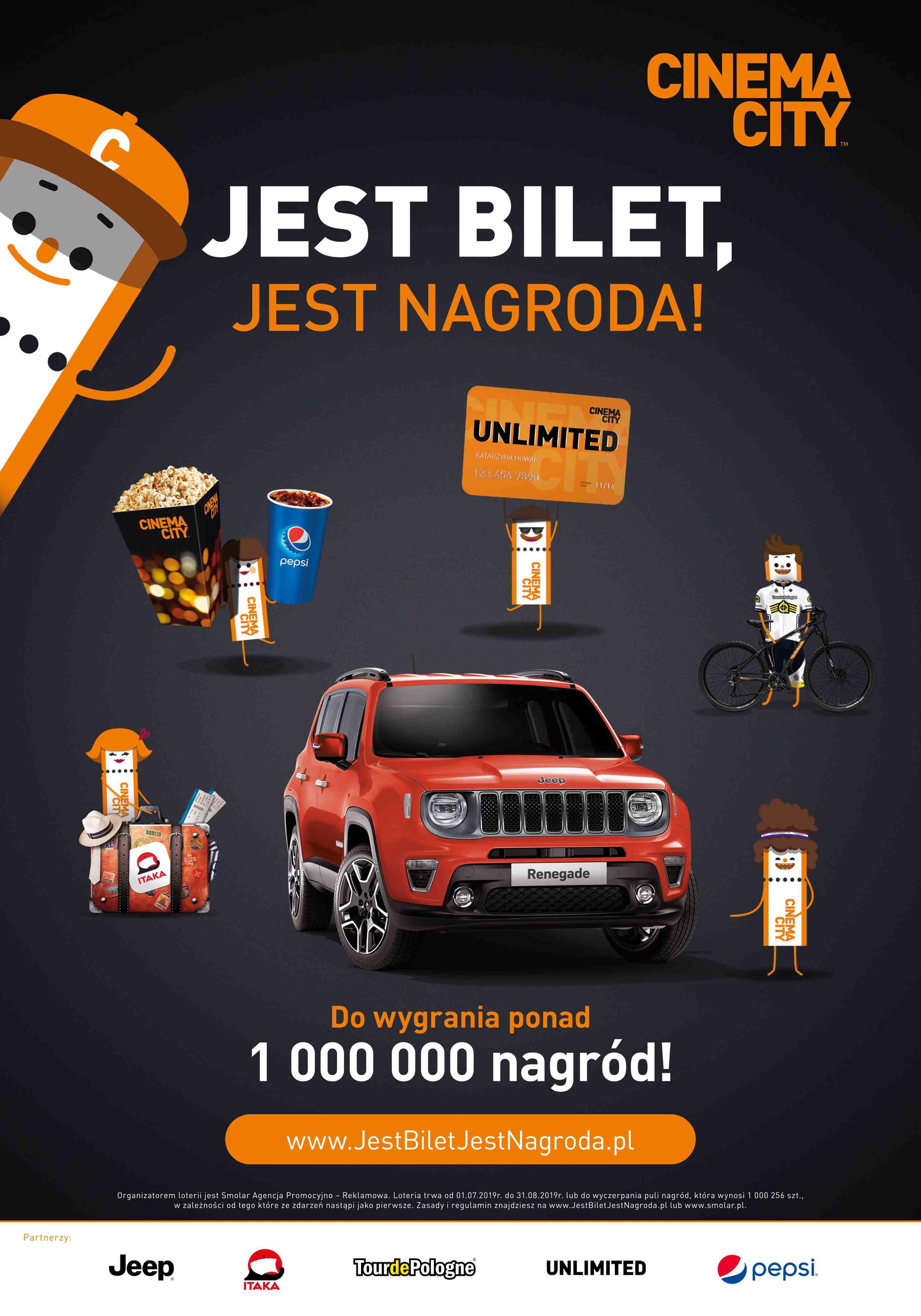Już 1 lipca w Cinema City rusza letnia loteria „JEST BILET, JEST NAGRODA” z mega nagrodami! Wystarczy kupić bilet na dowolny seans i sprawdzić, co wygrałeś, ponieważ w Cinema City wygrywa każdy! Czekają Jeep Renegade, vouchery wakacyjne ITAKA, karty upominkowe ORLEN, rowery oraz stroje kolarskie Tour de Pologne, karty Unlimited i wiele innych kinowych nagród. Nie czekaj i wpadnij do kina na film i po gwarantowaną nagrodę! Szczegóły w kasach kin oraz na stronie www.JestBiletjestNagroda.pl