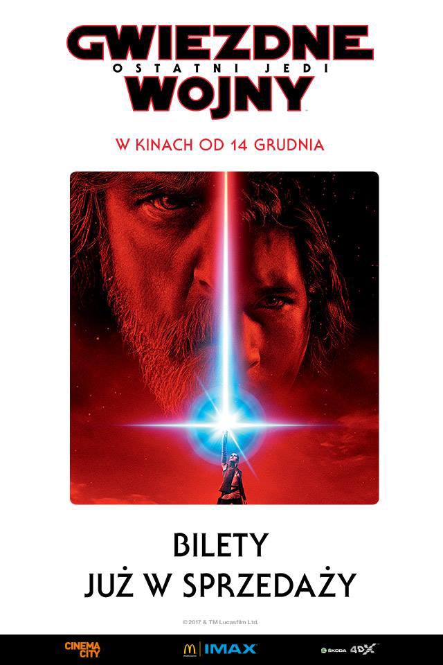 Ruszyła przedsprzedaż biletów na najbardziej oczekiwany hit tego roku: „Gwiezdne wojny: Ostatni Jedi”. Premiera filmu odbędzie się 14 grudnia. Już teraz możesz kupić bilet na seans w Cinema City, IMAX lub w ŠKODA 4DX. Bilety są dostępne w kasach kin oraz na stronie www.cinema-city.pl
