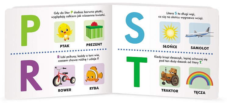 Krótkie wesołe rymowanki i kolorowe ilustracje pomagają zapamiętać kształt poszczególnych liter, a zabawa w wyszukiwanie rozwija spostrzegawczość malucha oraz w przyjemny sposób uczy kojarzenia wyrazów z literami, od których się zaczynają. Twarde strony i ulubieni bohaterowie są gwarancją, że książka będzie cieszyć dziecko przez długi czas.