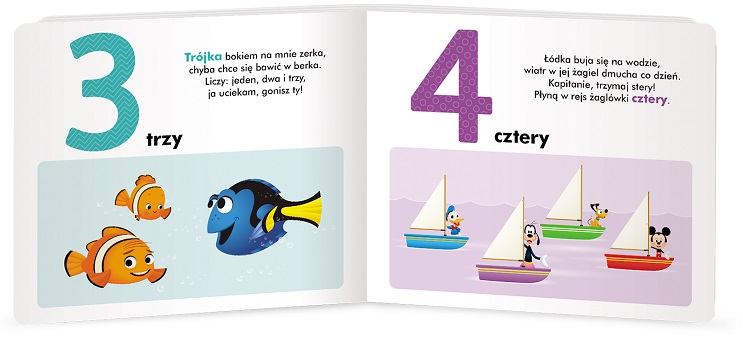 Krótkie wesołe rymowanki i kolorowe ilustracje pomagają zapamiętać kształt poszczególnych cyfr, a zabawa w wyszukiwanie rozwija spostrzegawczość malucha oraz w przyjemny sposób uczy liczenia elementów. Twarde strony i ulubieni bohaterowie są gwarancją, że książka będzie cieszyć dziecko przez długi czas.