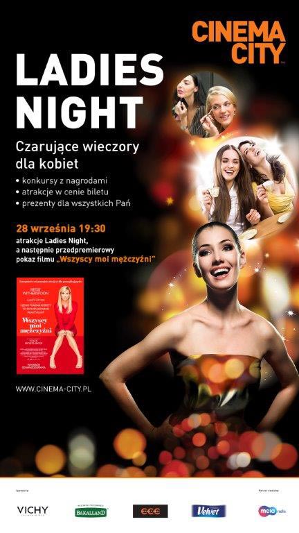 W czwartek 28 września o godz. 19:30 odbędzie się pierwsza, powakacyjna edycja „Ladies Night” - cyklicznej imprezy dla Pań z filmowym pokazem przedpremierowym i mnóstwem konkursów z atrakcyjnymi nagrodami. W tym miesiącu pokażemy komedię romantyczną „Wszyscy moi mężczyźni” z genialną Reese Witherspoon w roli singielki, która szukając tego jedynego, wikła się w mnóstwo zabawnych, damsko-męskich relacji. Zapraszamy do wybranych kin Cinema City. Bilety są już dostępne w kasach kin oraz na stronie www.cinema-city.pl