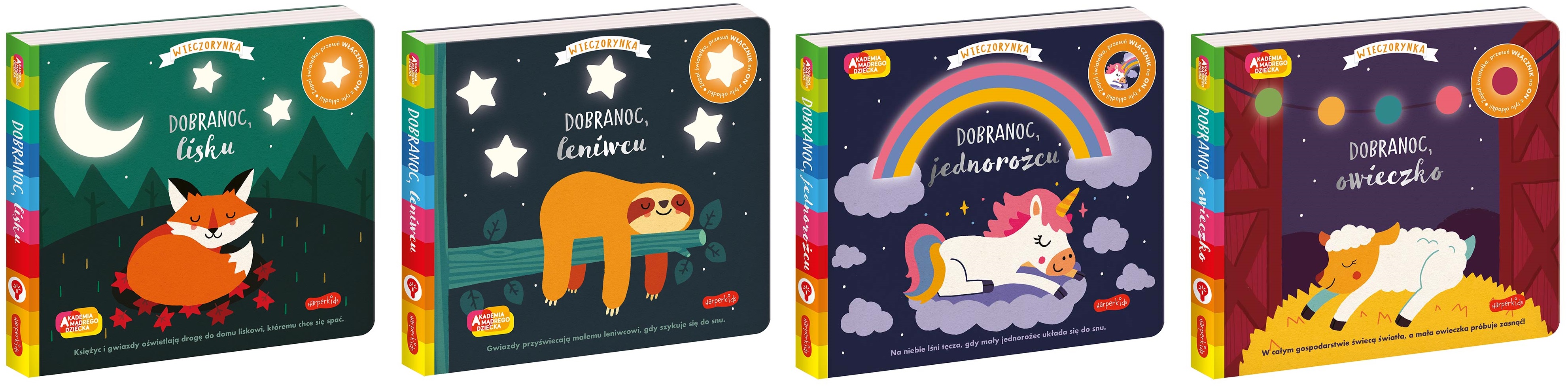 Nowa seria świecących książeczek, których celem jest pobudzić zmysł wzroku maluszka. Książeczki z serii „Wieczorynka” są dobrym sposobem na wyciszenie maluszka przed snem, dzięki spokojnej bajeczce o zasypianiu i stonowanym światełkom.