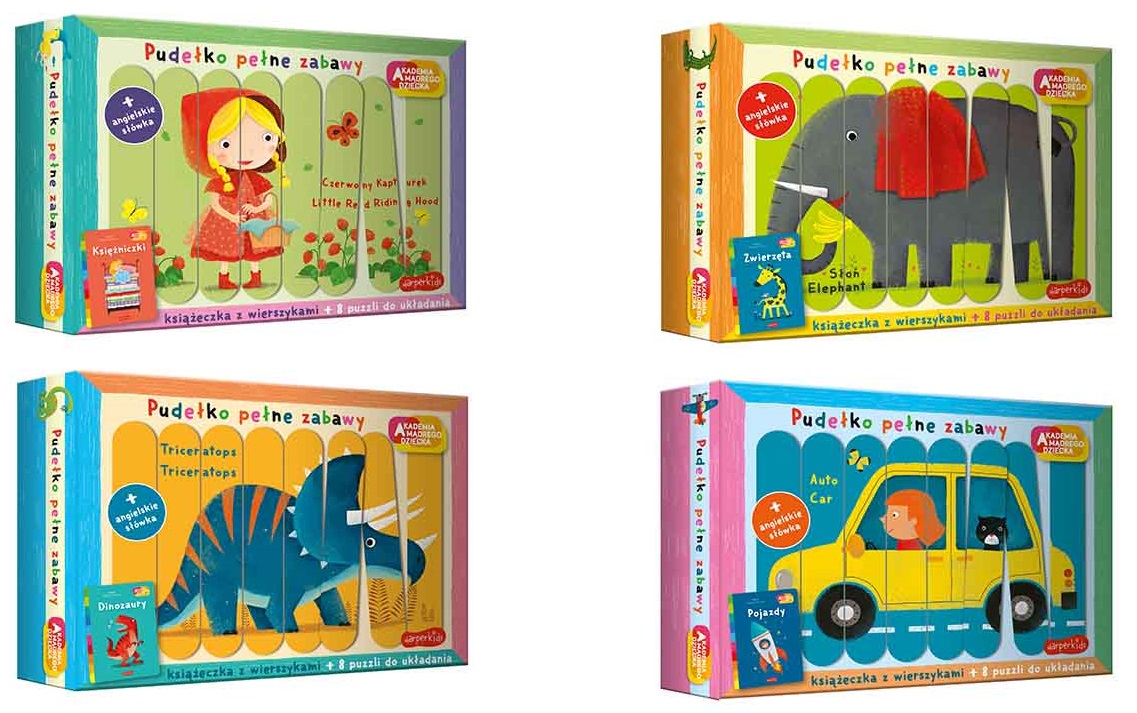 Pudełko pełne zabawy to zestaw zawierający książeczkę z rymowankami oraz puzzle. Po przeczytaniu wierszyków dziecko może ułożyć puzzle. Każdy obrazek składa się z 8 elementów. Zestaw zawiera tackę, która służy jako podkłada do układania. Czytanie i układanie elementów korzystnie wpływają na rozwój dziecka. Puzzle rozwijają motorykę małą, czyli pomagają ćwiczyć sprawność rąk, chwytność palców i precyzję ruchów, a wspólne czytanie pomaga rozwijać wyobraźnię oraz wzbogaca słownictwo.