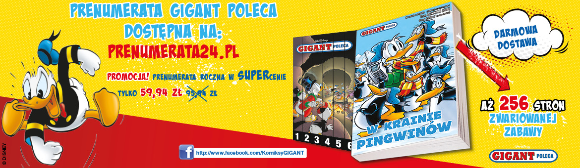 Twoje dziecko jest fanem Kaczora Donalda i z niecierpliwością wyczekuje kolejnego tomu „Gigant Poleca”, a Ty nie zawsze pamiętasz o zakupie komiksu? Mamy dla Was rozwiązanie idealne, czyli zakup ulubionego dwumiesięcznika w prenumeracie!
