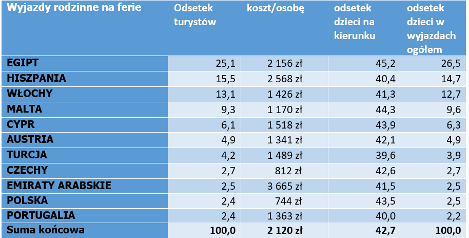 Dobrze widać to w wypadku narciarskich wyjazdów do Austrii I Włoch gdzie koszt odpowiednio wynosi 1341 zł I 1426 zł wobec wyjazdów klientów również bez dzieci, gdy wartości te rosną odpowiednio do ok 1600 zł I 1690 zł. Wyjazdy rodzinne na narty są jak widać tańsze o ok. 300 zł na osobę. W wypadku najpopularniejszych kierunków jak Egipt I Wyspy Kanaryjskie różnica na korzyść wyjazdów rodzinnych wynosi ok 100 – 200- zł).