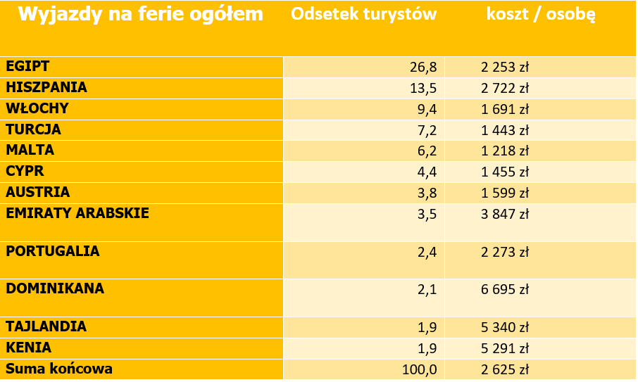Rodziny z dziećmi, rezerwujące wyjazdy na ferie w biurach podróży, wybierają przede wszystkim Egipt a te, które chcą spędzić je na śniegu – włoskie kurorty narciarskie. Te wyjazdy są sporo tańsze od przeciętnych wypraw w tym czasie. Rodziny korzystają bowiem ze zniżek na dzieci, rezerwowały ferie wcześniej I rzadziej wybierają się do egzotycznych krajów.