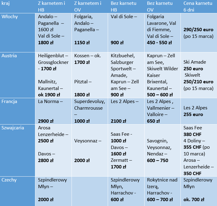 Jednak w wypadku Włoch przepłacimy ok 200 – 400 zł. W Austrii i Francji – ok 100 – 200 zł. Najmniej opłacalna jest wyjazd z dokupowanym na miejscu karnetem, jeśli decydujemy się na wyjazd do Szwacjarii. Tu różnica w cenie wynosi od ok 300 do 500 zł.