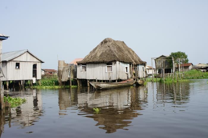 Ganvie, miejscowość w południowym Beninie. Po prawej stronie tradycyjna chata z dachem ze strzechy, po lewej chata kryta dachem z blachy falistej, który rdzewieje i nagrzewa się do wysokich temperatur – „kiedy postęp ma ulepszać”