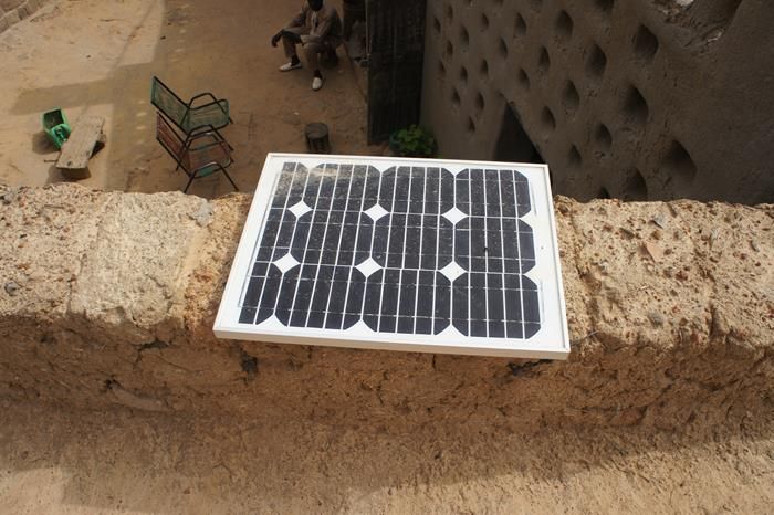 Lampa solarna, ulokowana na dachu glinianego domku, pośród traw sawanny. Większość europejskich lamp solarnych nie spełnia funkcji w Afryce, ponieważ słońce zbyt mocno grzeje a solar nie jest w stanie pochłonąć jego energii