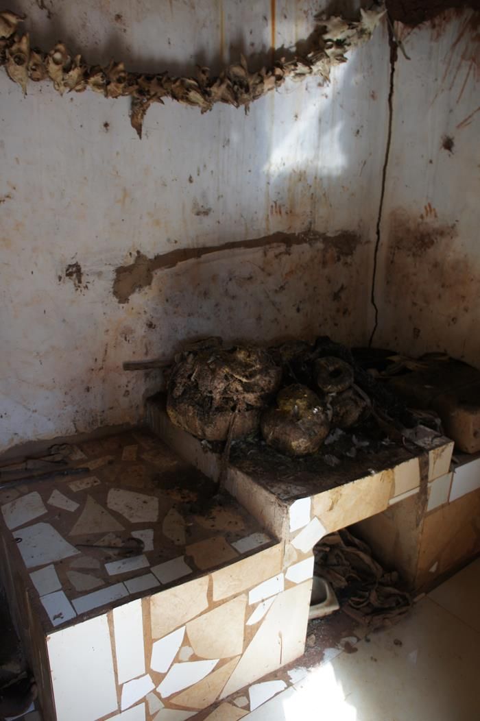 Ołtarz voodoo do składania krwawej ofiary, w chacie szamana voodoo w południowym Beninie