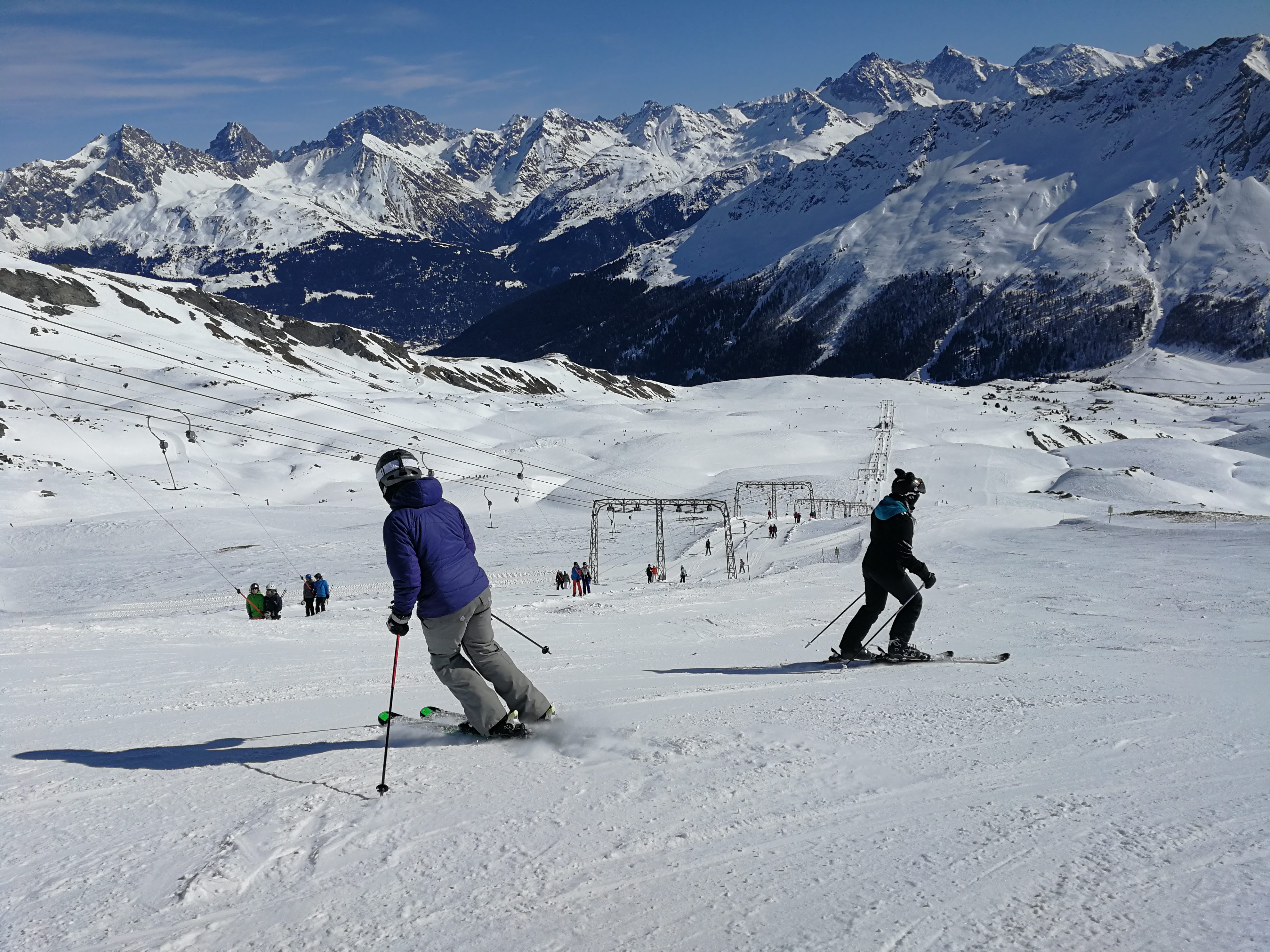 Zjazd z Piz Cartas niebieskim wariantem, częściowo trasą wytyczoną również dla saneczek (o łącznej długości 6 km!) to kolejne kilkanaście km frajdy po skąpanych w słońcu trasach. Przeważająca ich bowiem część ma południową ekspozycję a słońce dzięki łagodnemu klimatowi doliny Surses ze znacznymi wpływami południa świeci tu bardzo często.