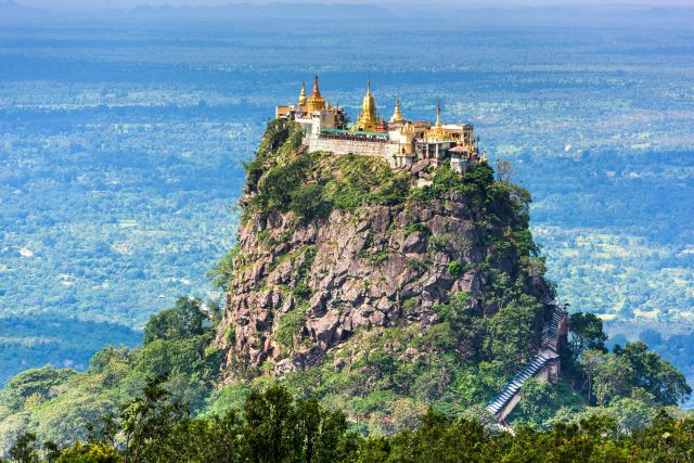 Położony na wysokości 737 metrów, na szczycie dawnego komina wulkanicznego buddyjski klasztor Taung Kalat to nie tylko miejsce zamieszkiwane przez mnichów i odwiedzane przez turystów, ale również dom dla 37 natów – czczonych w Birmie duchów opiekuńczych. Klasztor ze swymi złotymi kolumnami góruje nad okolicą osadzony na czubku masywnej skały o pionowych ścianach. Na szczyt prowadzą strome schody. Warto podjąć wspinaczkę, to jedno z najbardziej surrealistycznych miejsc na świecie.