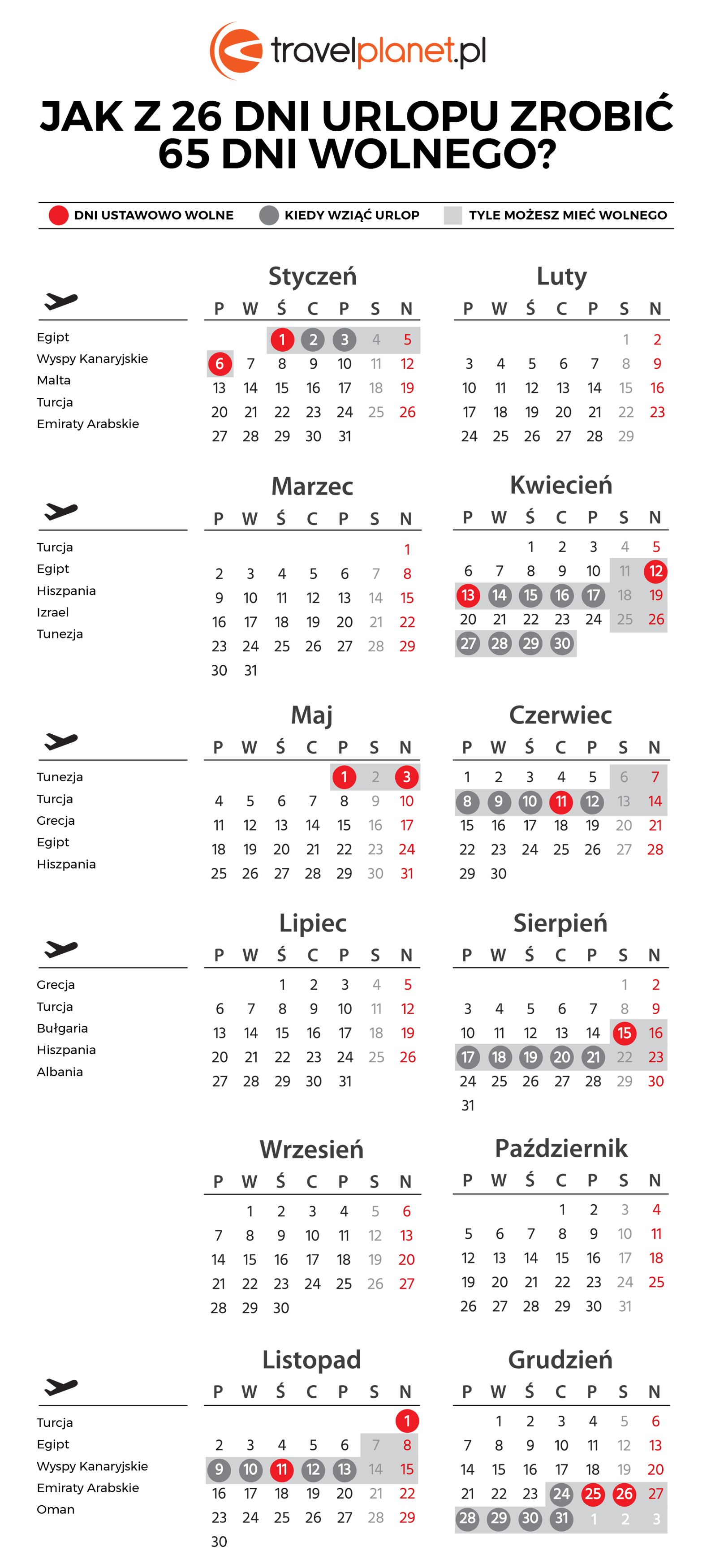 Zaczynasz powoli snuć plany na przyszłoroczny urlop? Świetnie się składa – przygotowaliśmy kalendarz, dzięki któremu z łatwością sprawdzisz, kiedy wypadają dni wolne 2020. To ułatwi odpowiednie zaplanowanie wyjazdów na długie weekendy, aby zyskać jak najwięcej wolnego. Zobacz, co zrobić aby wypoczywać jak najdłużej i sprawdź gdzie warto pojechać w wybranych miesiącach!